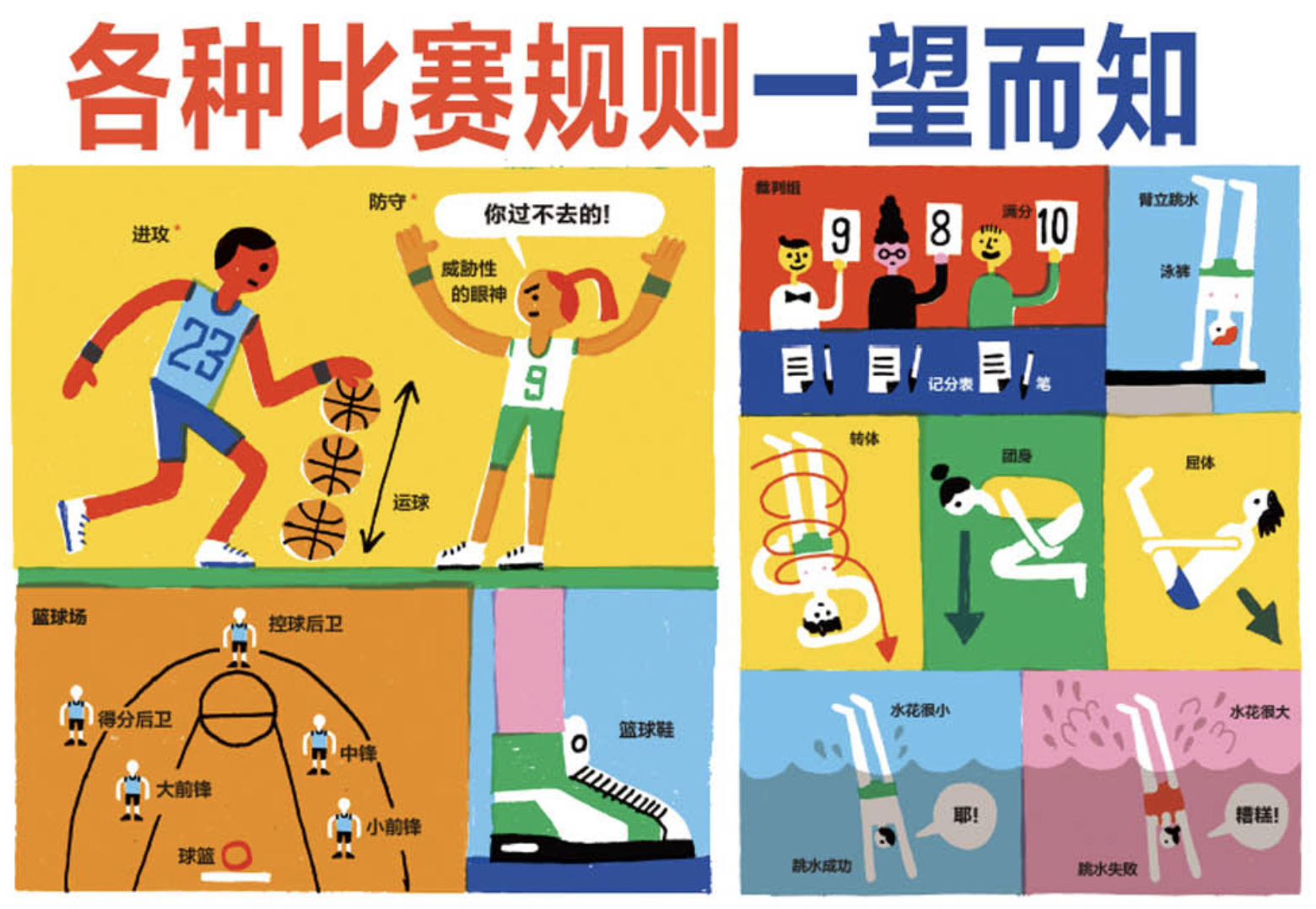 在本书的最后还有一个针对每种运动的简要介绍。考虑到互动性在书中还设置了一页中场休息,以便于小读者操练前半部分的体育项目的基本信息。